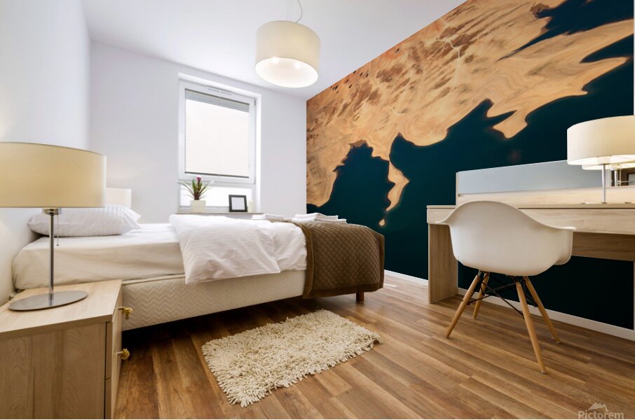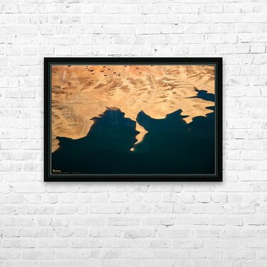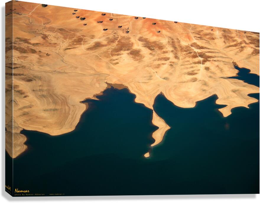 This striking aerial photograph captures the winding shoreline of a reservoir in Fars Province, Iran. The deep azure waters carve into the golden earth, creating organic shapes that resemble a natural painting. The vivid contrast between land and water highlights the harmony and tension of nature, where fluidity meets solidity. A captivating fine art piece that brings both serenity and dramatic beauty to any space.