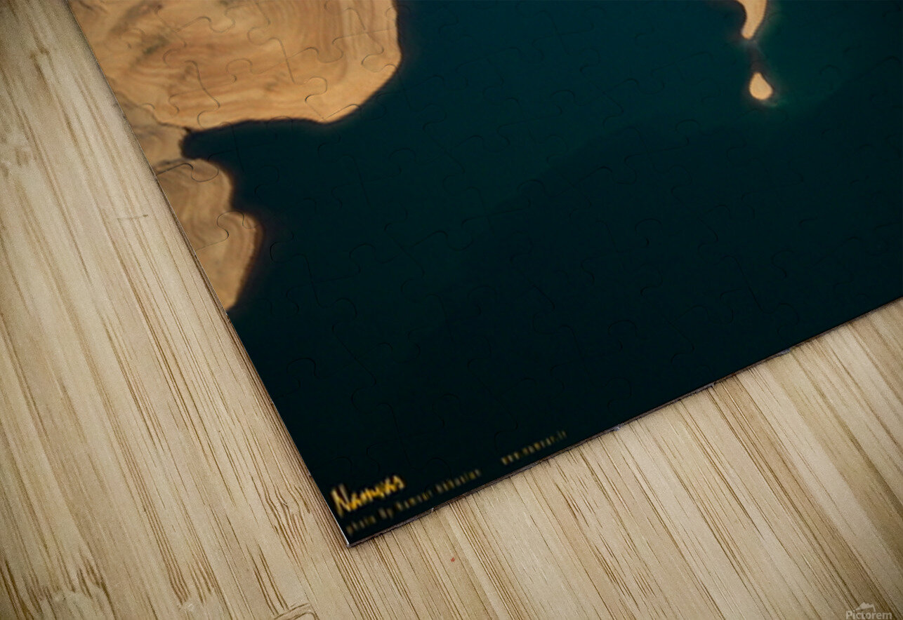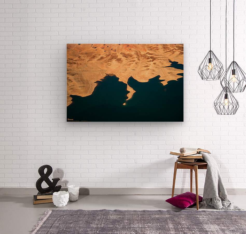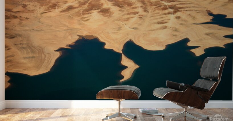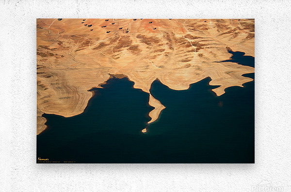 This striking aerial photograph captures the winding shoreline of a reservoir in Fars Province, Iran. The deep azure waters carve into the golden earth, creating organic shapes that resemble a natural painting. The vivid contrast between land and water highlights the harmony and tension of nature, where fluidity meets solidity. A captivating fine art piece that brings both serenity and dramatic beauty to any space.