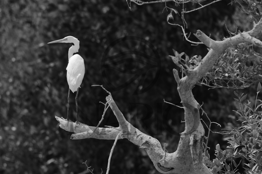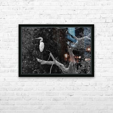 Perched gracefully on a weathered branch, this white heron stands as a guardian of the wilderness. The black-and-white composition enhances its elegan...[+]