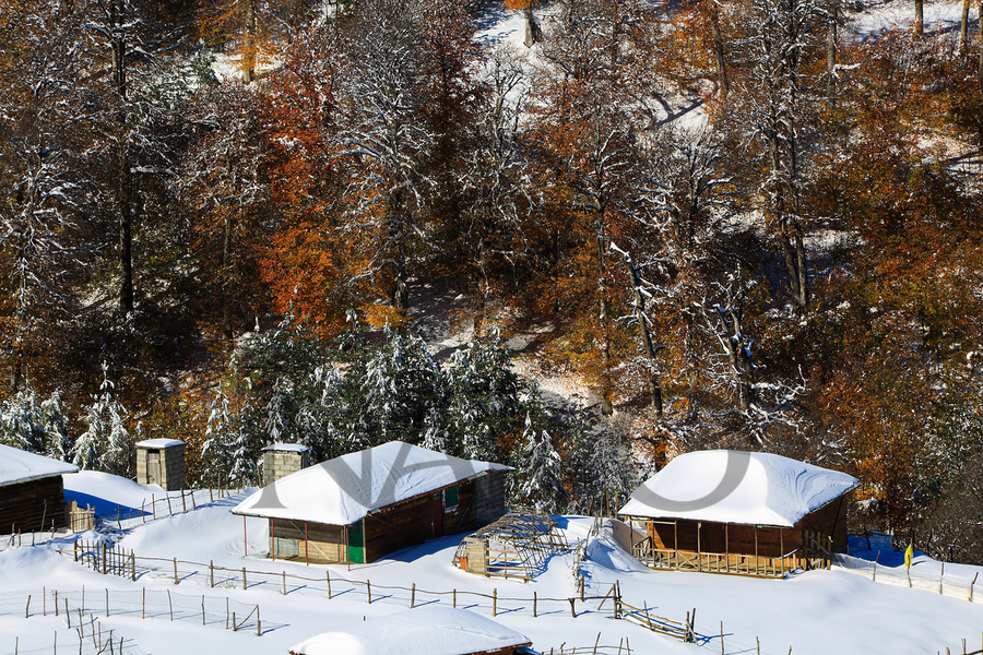 Captured along the scenic Asalem to Khalkhal road in northern Iran, this photograph showcases rustic wooden cabins embraced by a breathtaking winter l...[+]