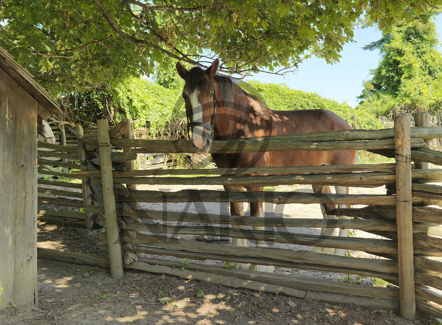 A gentle brown horse stands gracefully behind a rustic wooden fence, bathed in soft daylight beneath the shade of lush trees. This scene captures the ...[+]