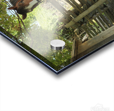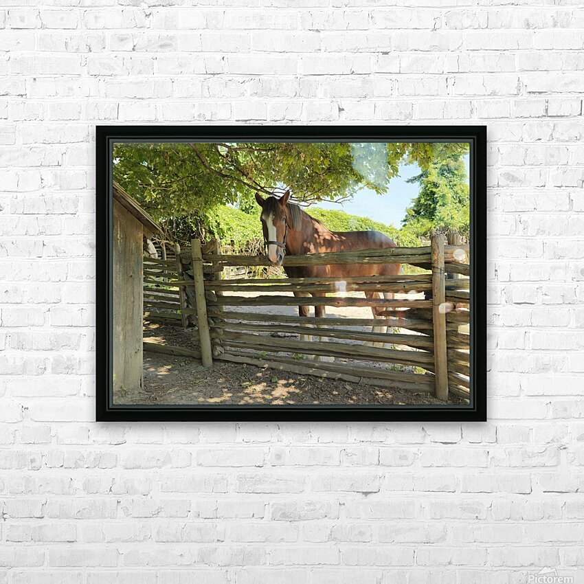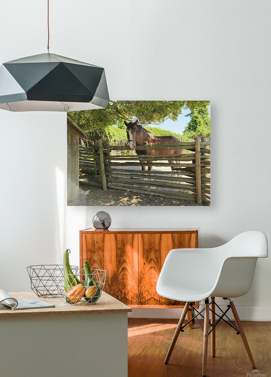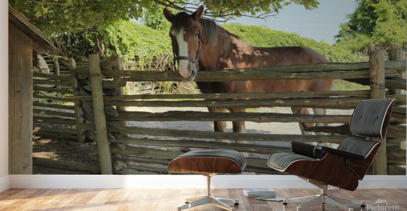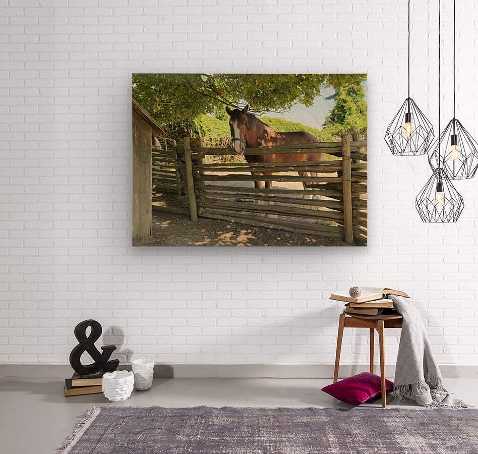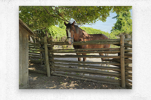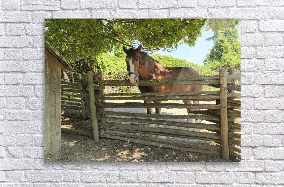 A gentle brown horse stands gracefully behind a rustic wooden fence, bathed in soft daylight beneath the shade of lush trees. This scene captures the timeless bond between nature and rural life, evoking peace, simplicity, and pastoral beauty. A perfect piece for animal lovers and those who appreciate countryside serenity.