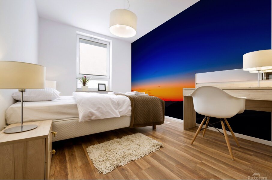A breathtaking horizon where fiery reds and oranges melt into deep blue twilight. The simplicity of this natural gradient creates a bold yet calming presence, making it a perfect statement piece for modern interiors. A minimalistic yet powerful portrayal of nature’s fleeting beauty.