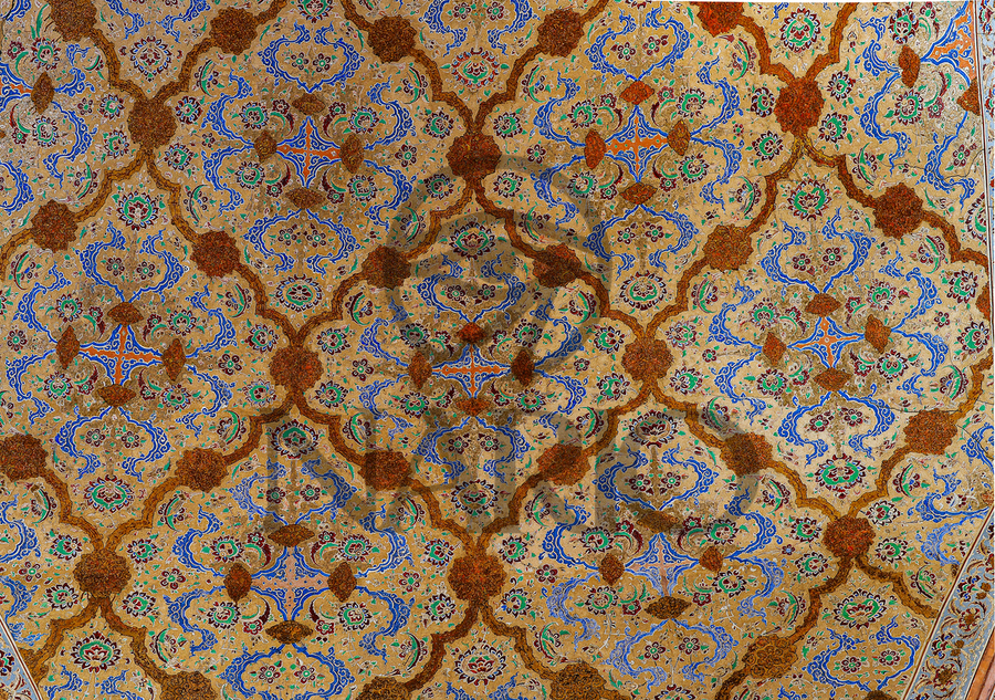 An intricate Persian ceiling design, resembling a celestial carpet woven with geometry, florals, and vibrant colors. The mesmerizing symmetry and deta...[+]