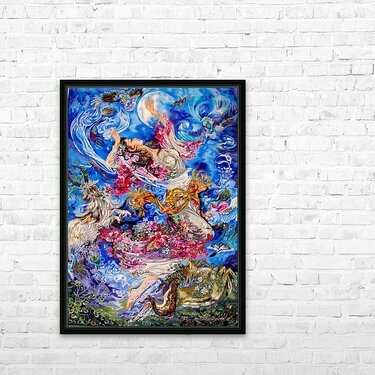 Persian Miniature Elegance This artwork, captured from a masterpiece carpet by the renowned Master Farshchian, is more than just a visual delight—it’s a timeless expression of Persian miniature art. With its rich colors, flowing forms, and dreamlike storytelling, it carries centuries of culture and artistry into a single frame. Perfectly suited as a luxury wall art or even as an exclusive wallpaper design, it transforms any space into a gallery of elegance and sophistication.