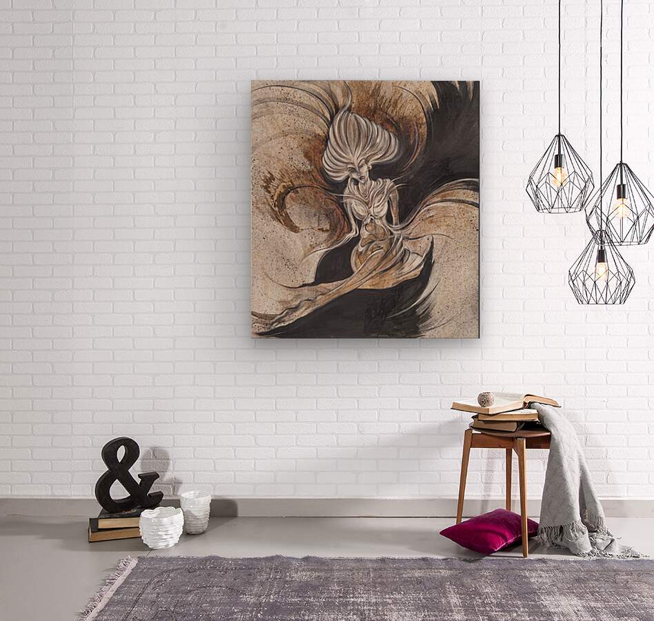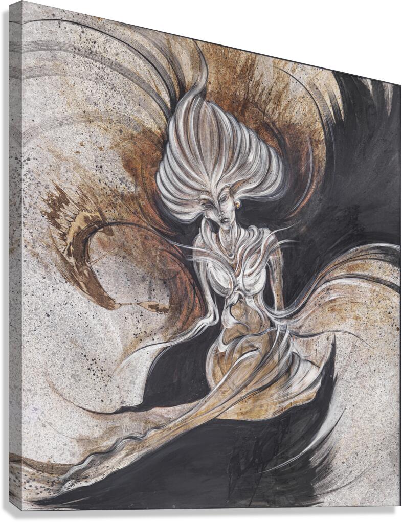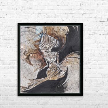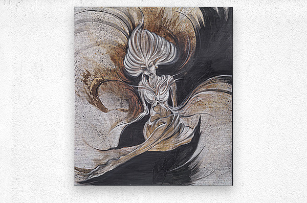 With sweeping arcs of black and bronze, this figure emerges in a state of powerful stillness. Her elongated form and flowing hair create an almost cosmic presence—part human, part elemental force. The textures and contrasts evoke both light and shadow, suggesting transformation, resilience, and the timeless duality of strength and vulnerability. A commanding artwork that embodies mystery, beauty, and the eternal dance of shadow and light.