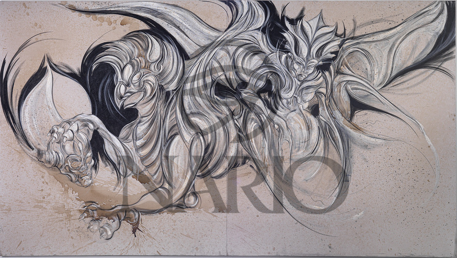 Dynamic and fierce, this composition brings to life mythical beings in motion—creatures that straddle the line between guardian and beast. Their for...[+]