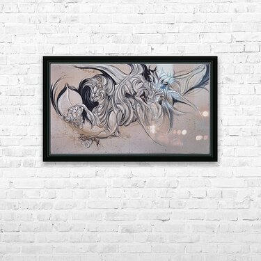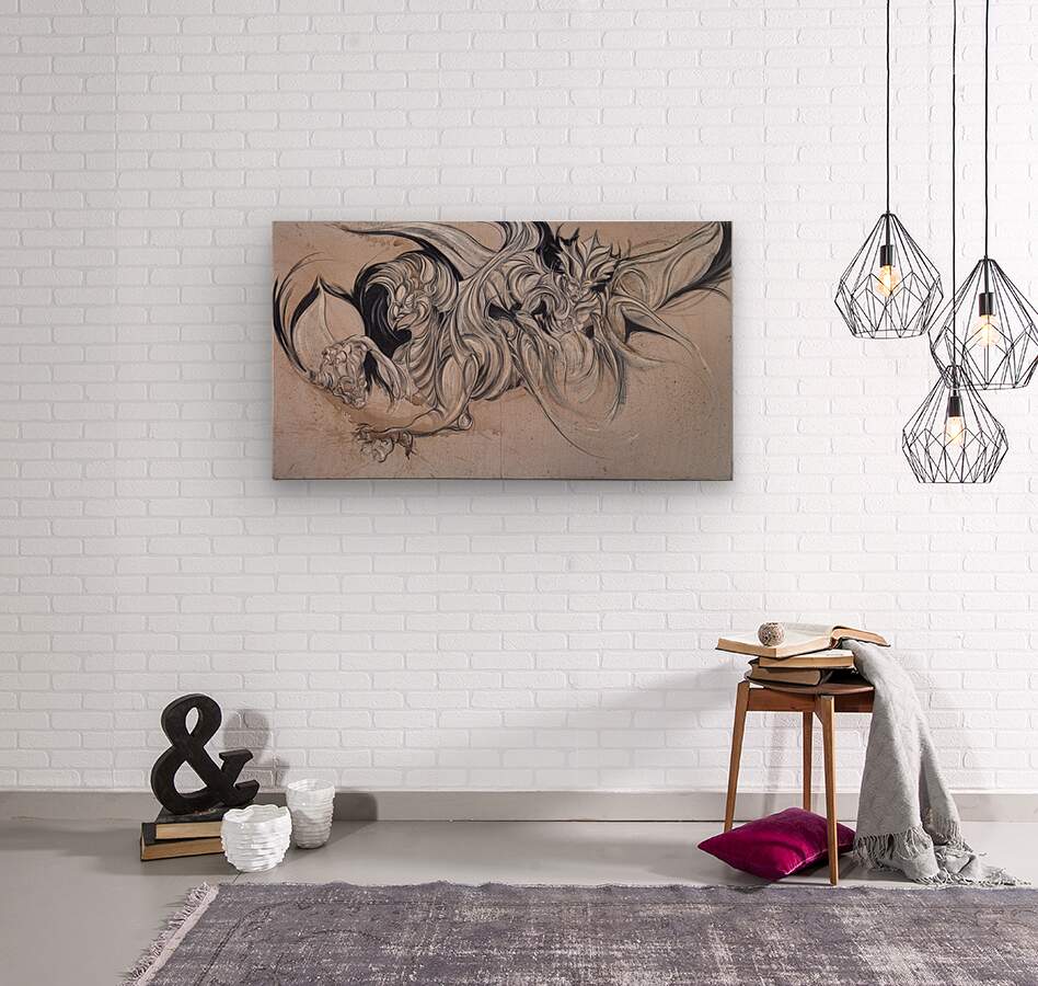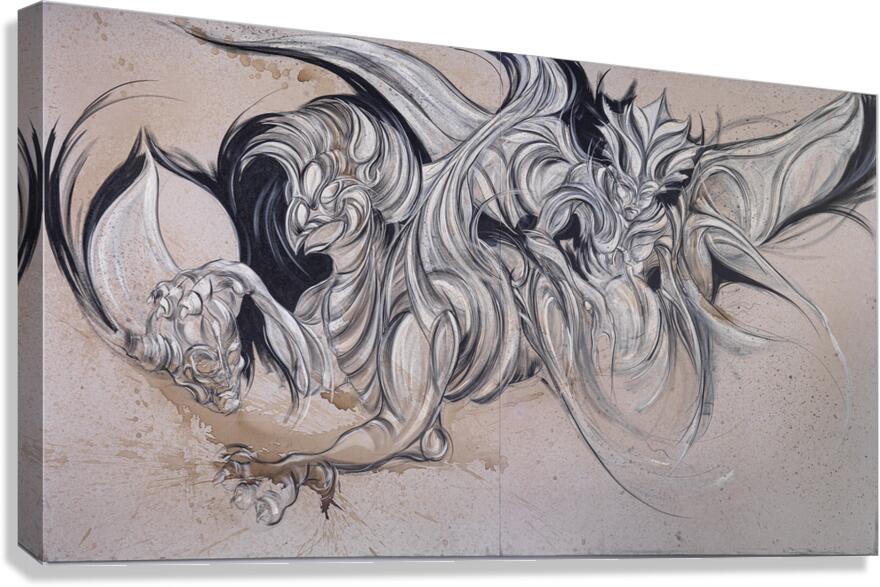 Dynamic and fierce, this composition brings to life mythical beings in motion—creatures that straddle the line between guardian and beast. Their forms, sculpted in flowing black and white strokes, ripple with raw energy, as though leaping out of the canvas. The tension between fluid grace and primal strength evokes both fear and reverence, echoing the timeless presence of protectors from ancient legends. A dramatic statement piece that embodies myth, power, and the eternal dance between creation and destruction.