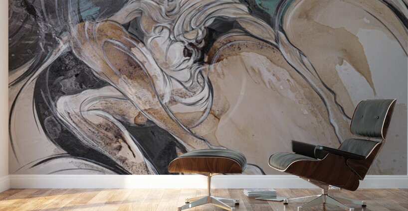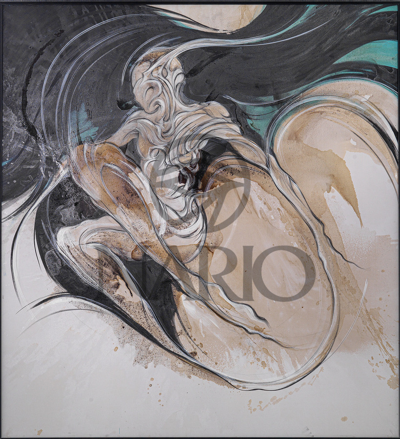 Swathed in sweeping arcs of black and muted earth tones, a faceless figure emerges with haunting elegance. The fluid contours give the impression of movement and stillness intertwined, as though the figure is suspended between worlds. The absence of facial detail turns the form into a universal presence—mysterious, introspective, and timeless. A contemplative piece that embodies both vulnerability and strength, inviting the viewer into the quiet depth of silence.
