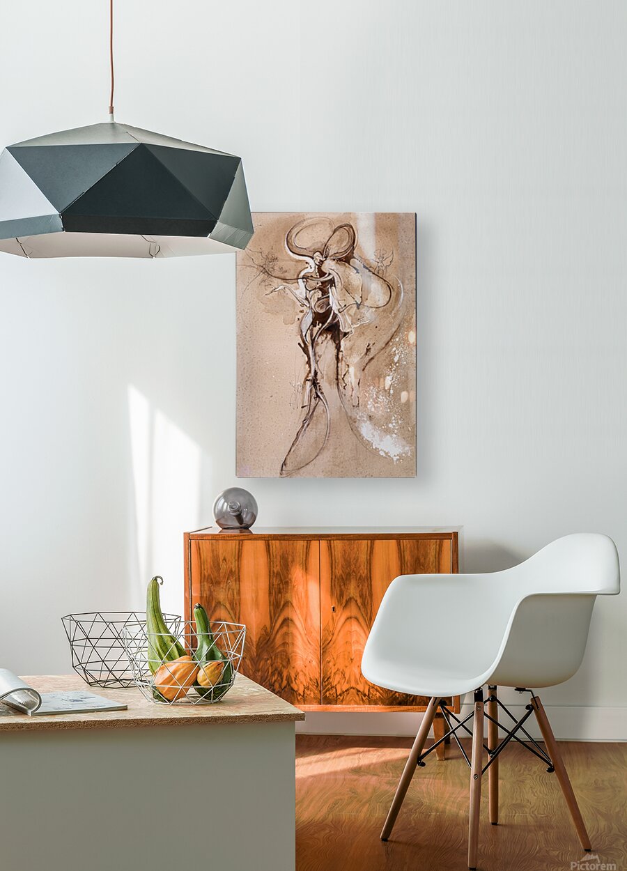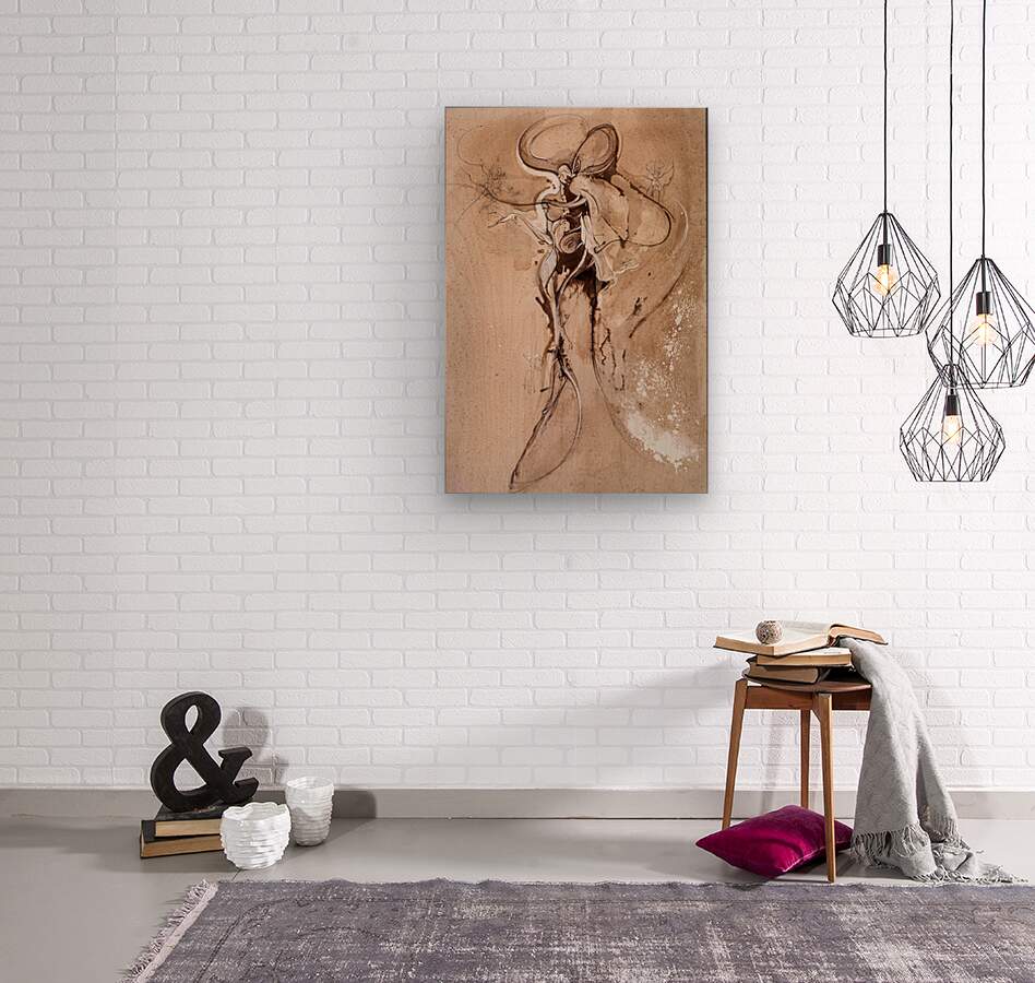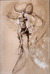 Elongated and graceful, this figure rises like a messenger from another realm. The sweeping sepia tones and delicate ink lines create both fragility a...[+]
