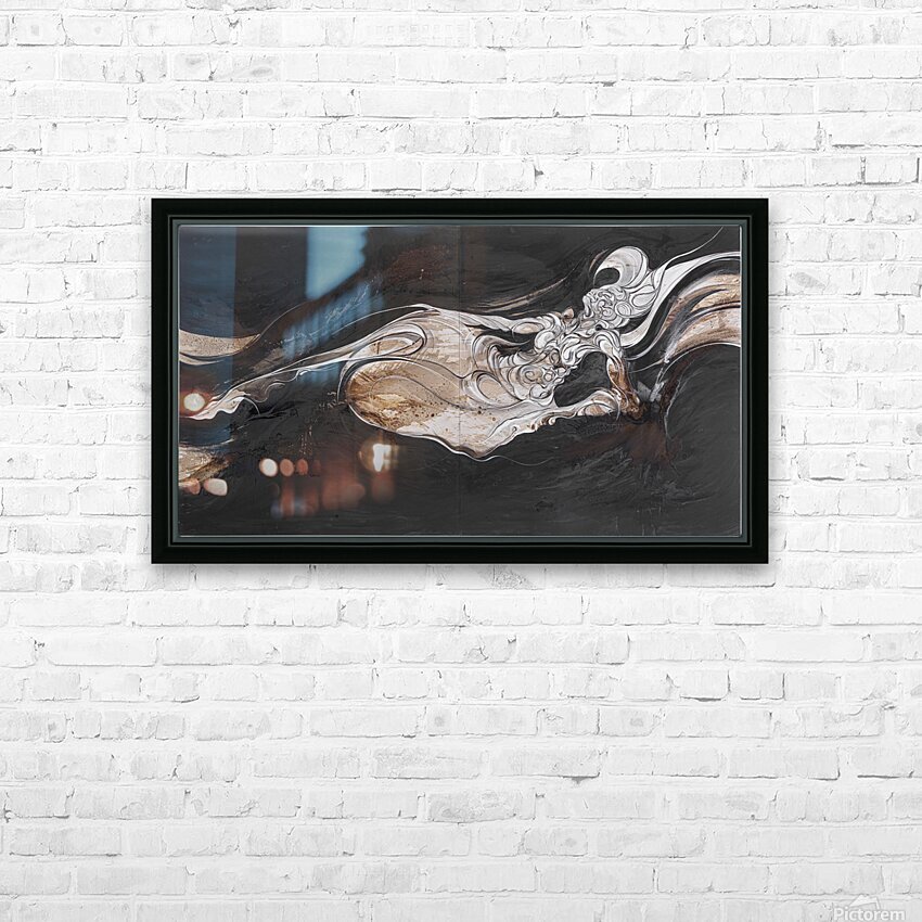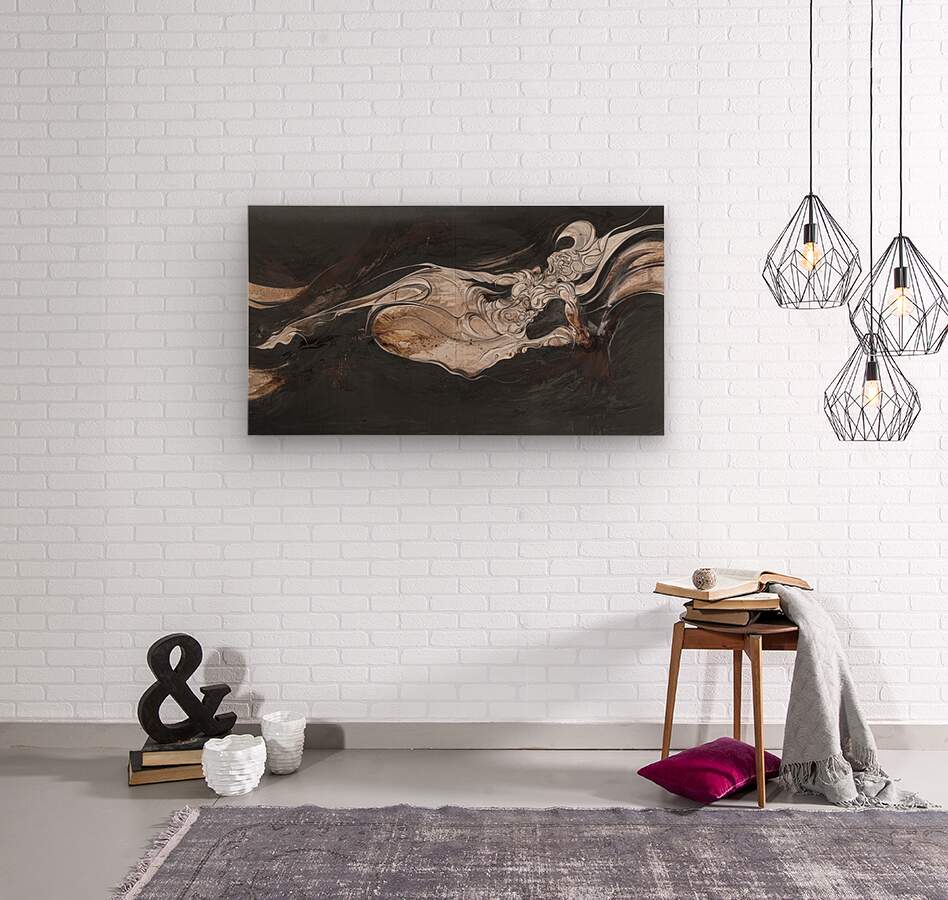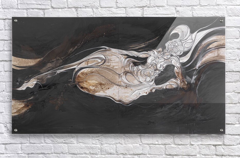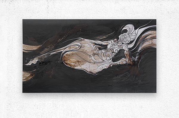 A reclining figure stretches across a dark expanse, their form sculpted in ivory and bronze swirls. The flowing lines suggest both rest and motion, as if the body is dissolving into shadow while simultaneously being carried forward by unseen currents. The contrast between the luminous figure and the black backdrop creates a haunting balance of serenity and mystery. A meditative piece that speaks of surrender, transformation, and the quiet beauty of twilight states.