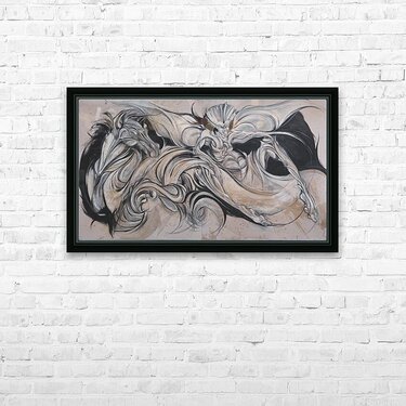 A powerful figure and a wild horse surge together in a whirlwind of motion, their forms entwined in sweeping arcs of black, ivory, and sepia. The energy of the composition conveys both control and chaos—an eternal struggle between human will and elemental force. The rider’s fierce expression and the horse’s unbridled energy merge into a vision of unstoppable momentum. A dramatic masterpiece that embodies strength, freedom, and the raw intensity of spirit in motion.