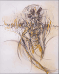 Emerging from a field of golden strokes, this figure radiates intensity and presence. The sharp lines of the hair and the muscular contours of the bod...[+]