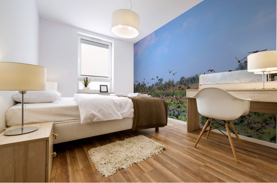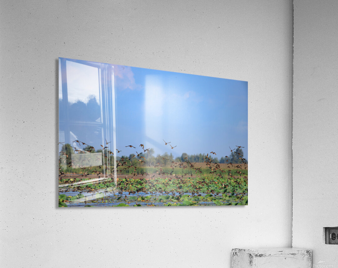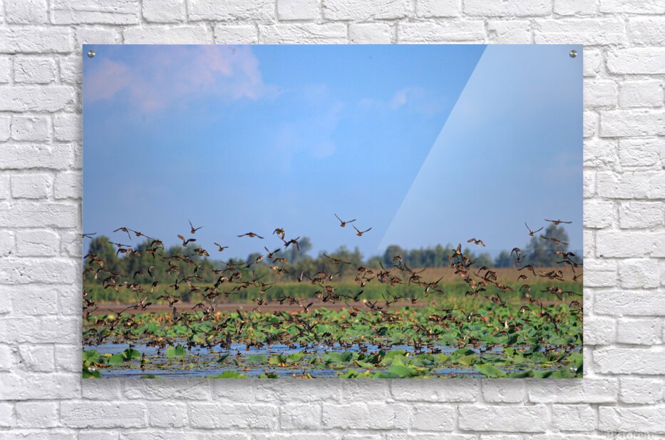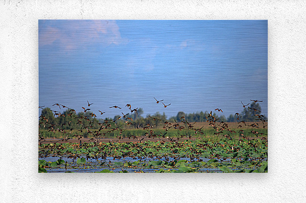 Celebrate the beauty of nature in motion. Flight of Freedom captures a breathtaking moment as flocks of birds rise above the wetlands under a clear bl...[+]