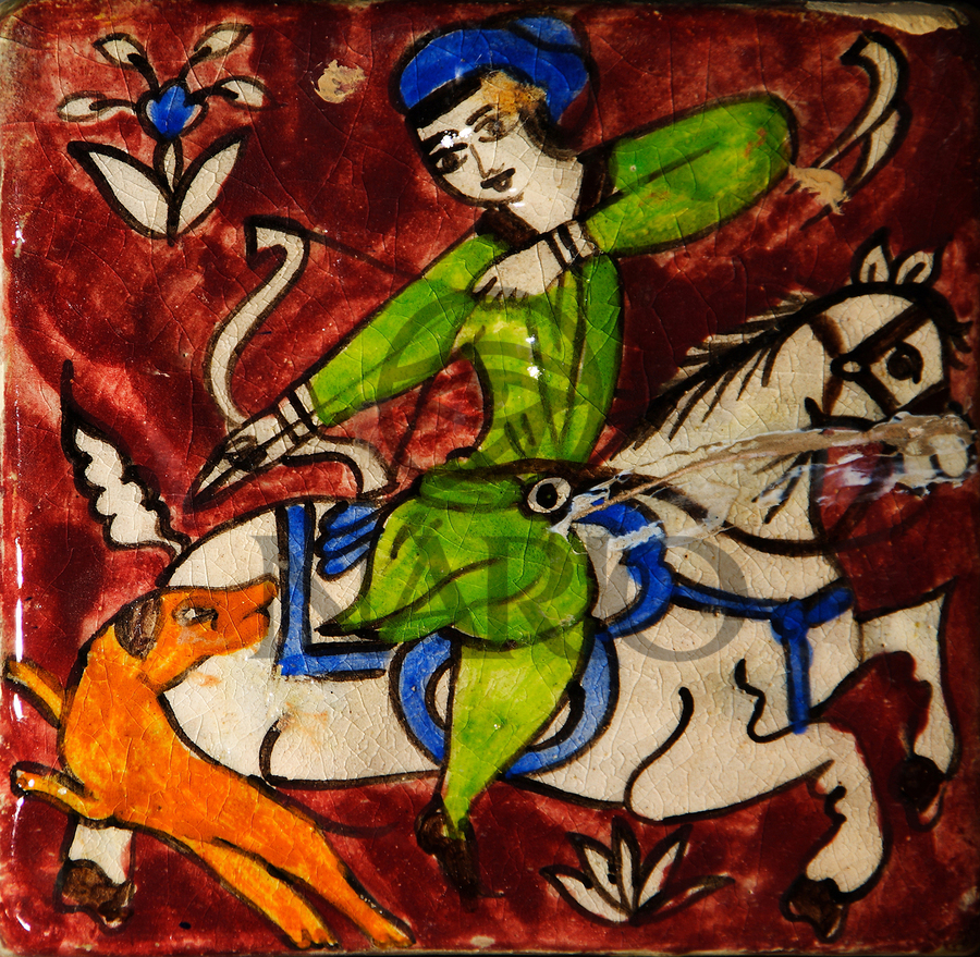 Step into the legends of Persia. Persian Hunt portrays a traditional hand-painted tile, capturing the dynamic motion of a rider aiming his bow while o...[+]