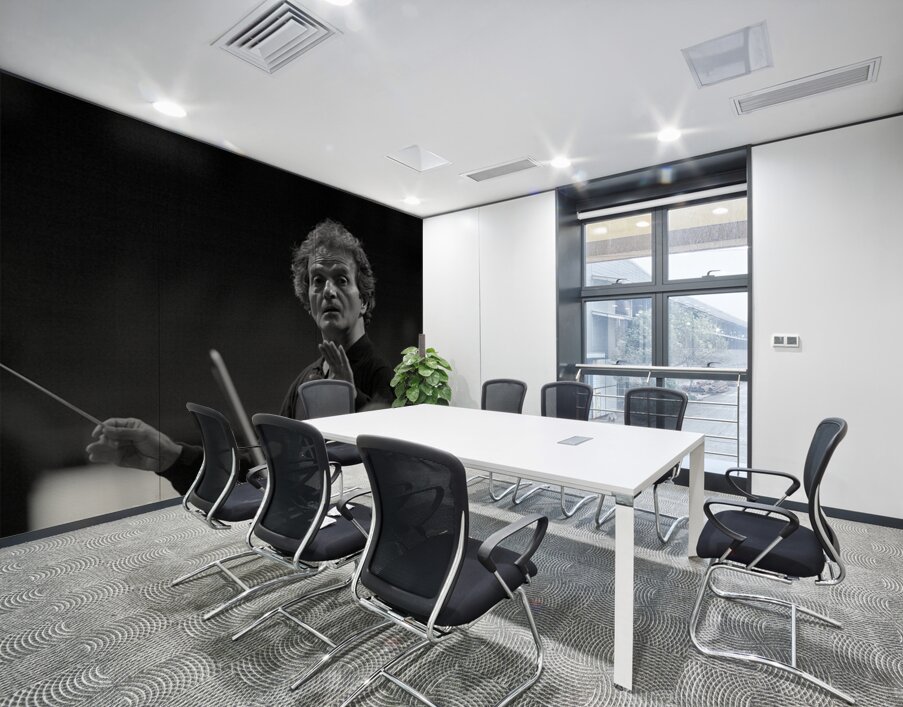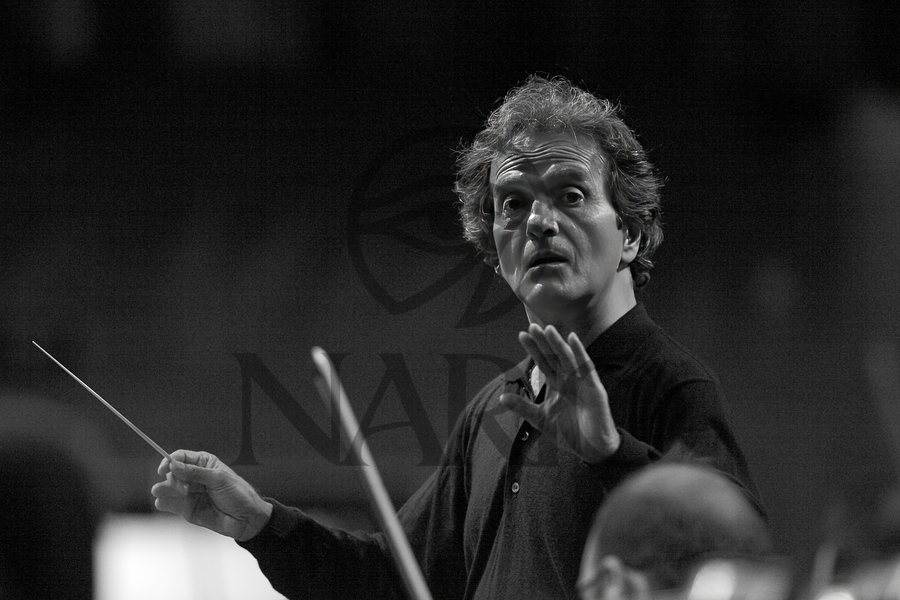 Caught between motion and stillness, the conductor commands the air with precision and emotion — guiding an unseen current of harmony. His gaze reve...[+]
