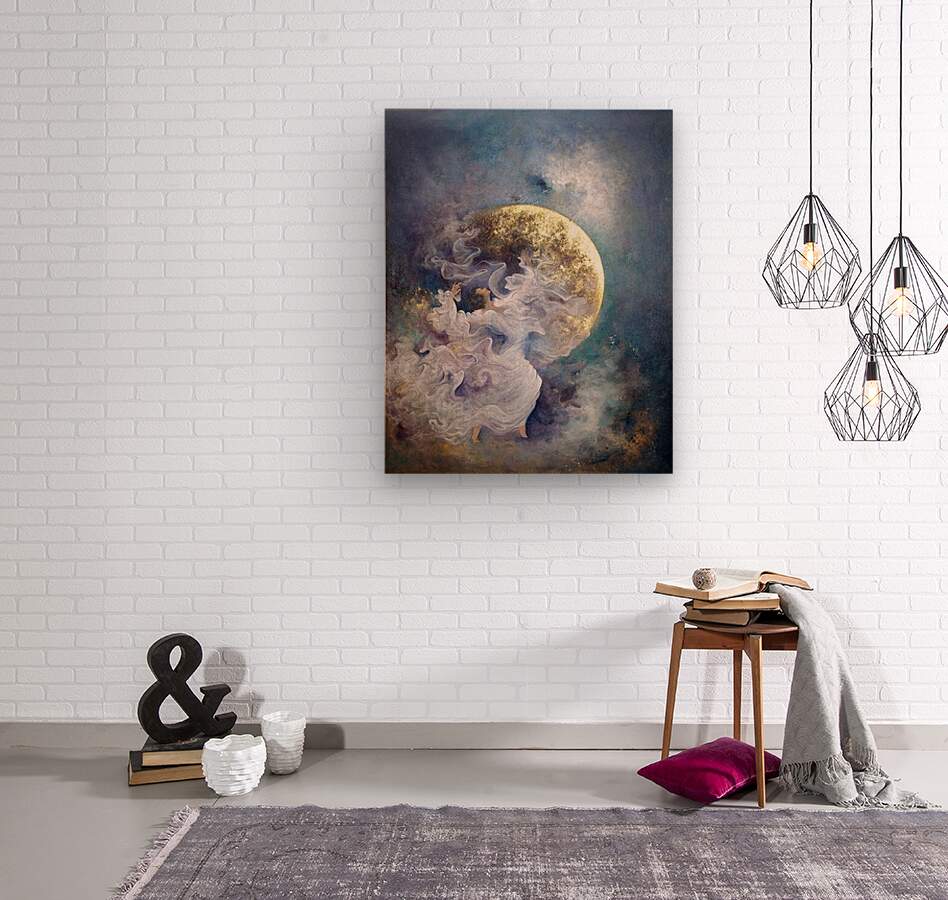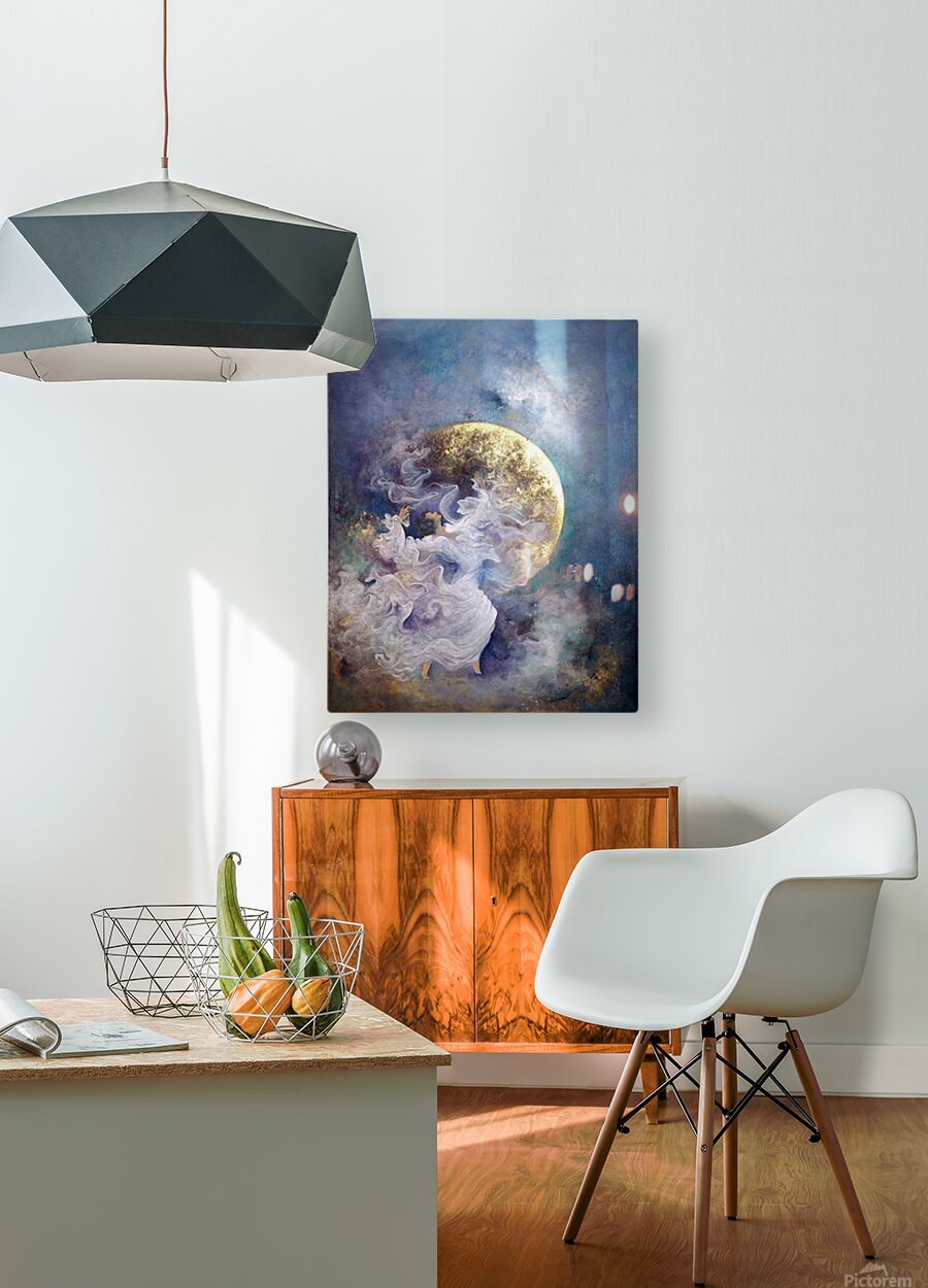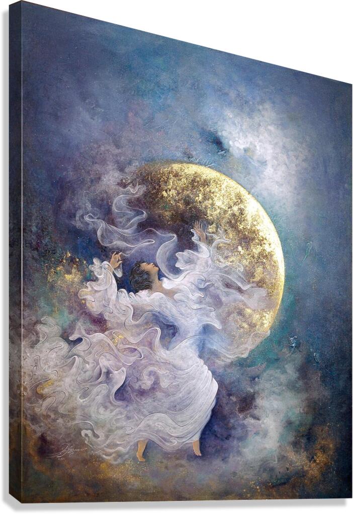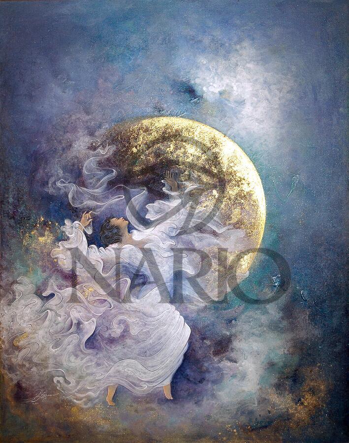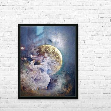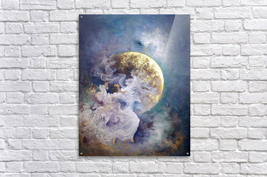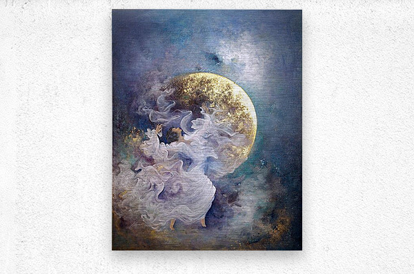 In Reaching God, Alijanpour captures the luminous moment of divine yearning — the soul’s surrender to the infinite. A celestial figure, clothed in clouds and light, rises toward a radiant golden moon — the timeless symbol of divinity and enlightenment. The dance of mist and form blurs the boundary between the earthly and the spiritual, suggesting that transcendence is not found in distance, but in awakening. Soft blues and golds intertwine like breath and prayer, while the figure’s open hands mirror a soul embracing its creator. Through this ethereal vision, Alijanpour reminds us that the divine is always near — found in movement, surrender, and the stillness between light and shadow.