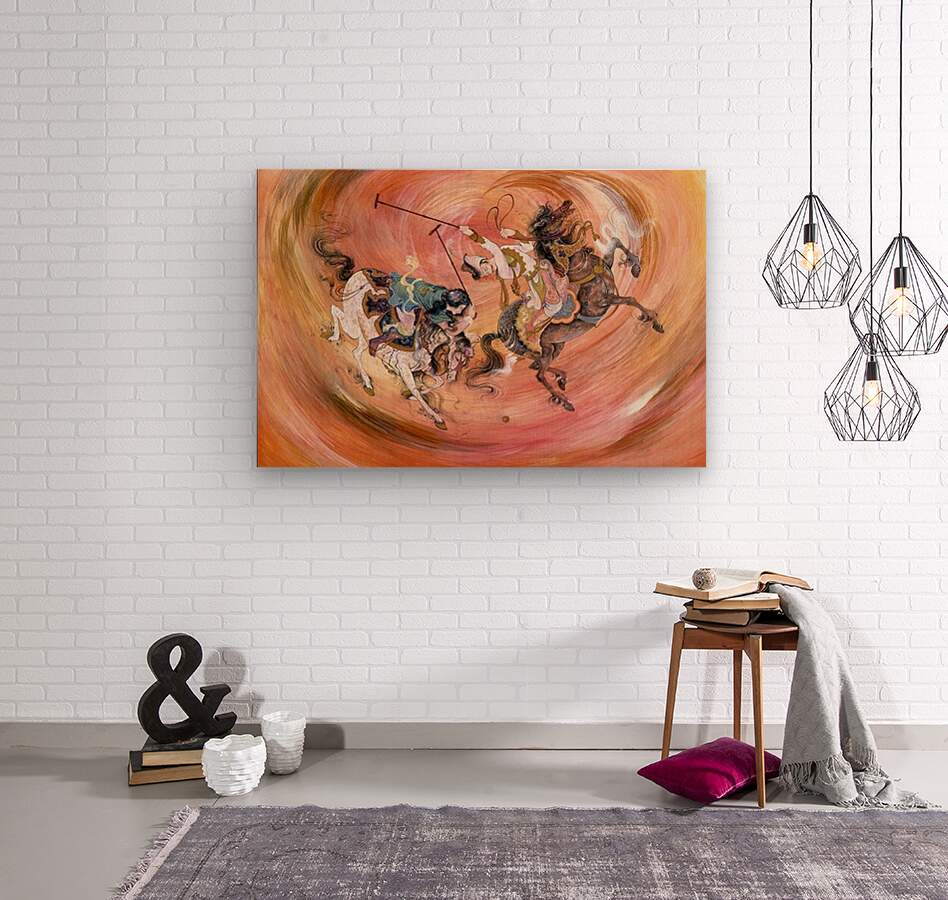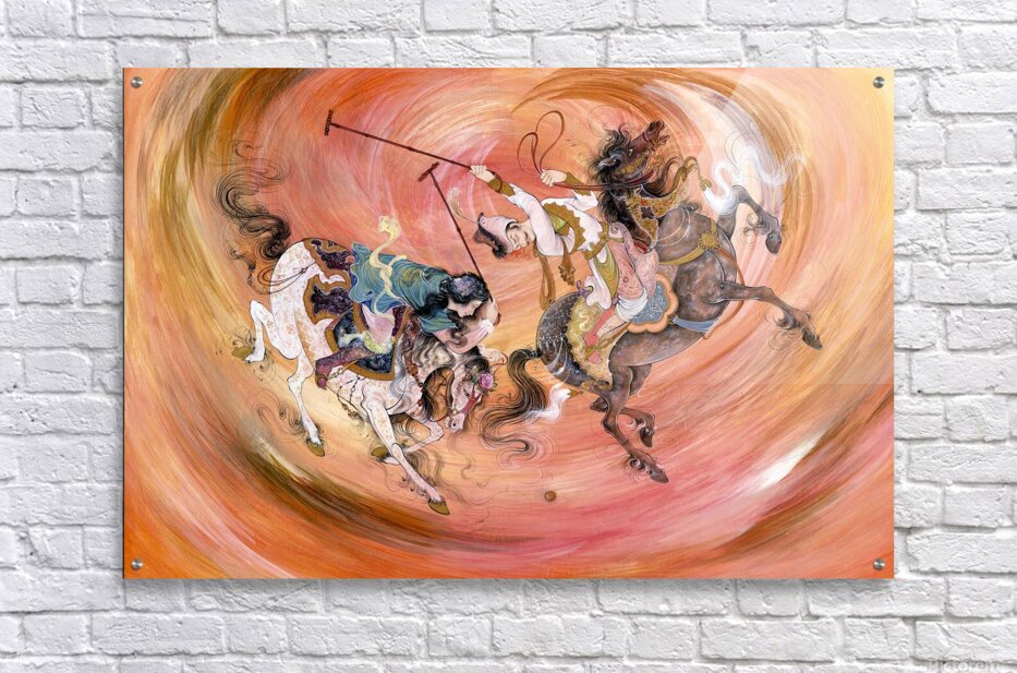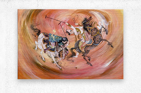 In Polo, Alijanpour revives the spirit of ancient Persian artistry through a breathtaking fusion of motion, elegance, and color. Two riders charge across a swirling vortex of energy — a visual symphony that blurs the line between sport and dance, competition and grace. Rendered in rich tones of amber, gold, and rose, the composition captures both the intensity of the moment and the timeless beauty of human and horse in perfect harmony. This piece is not just about the game of polo — it’s a tribute to rhythm, courage, and the eternal pursuit of mastery.