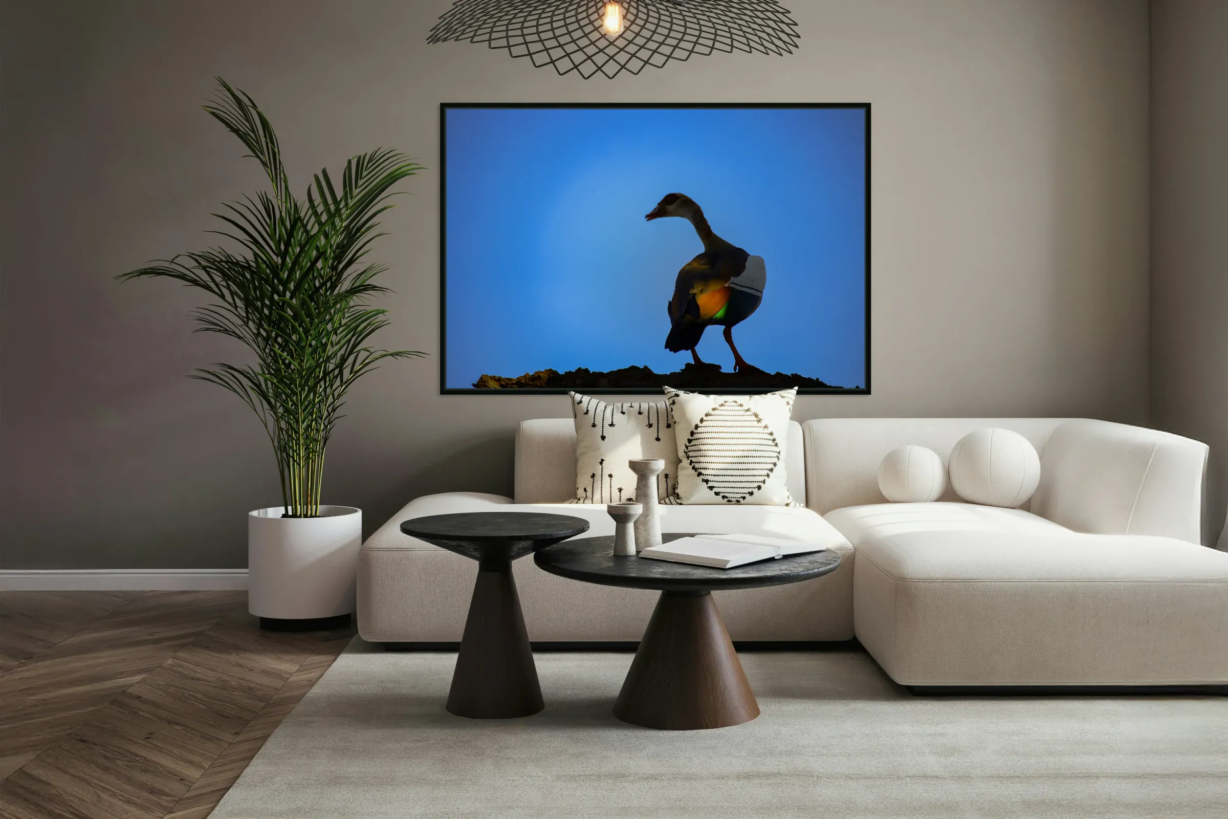 Imprimé jusqu’au bord et prêt à être accroché, avec un cadre flottant à l’arrière.