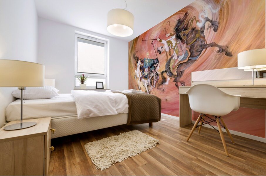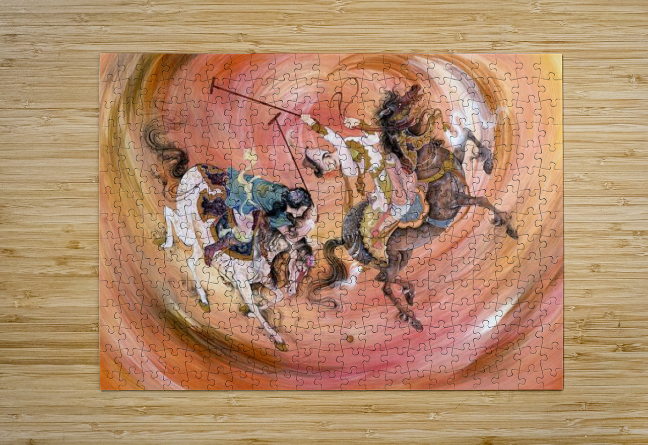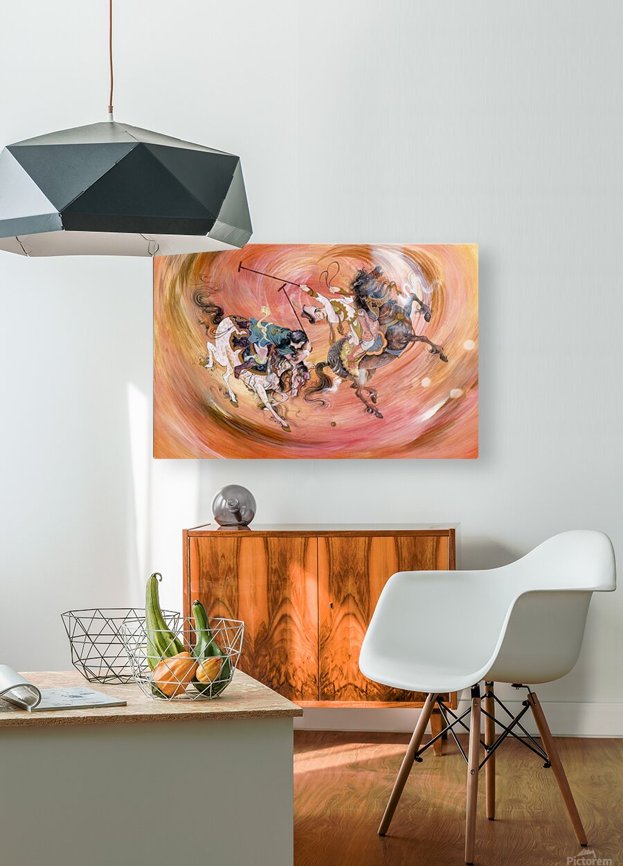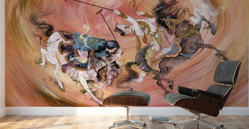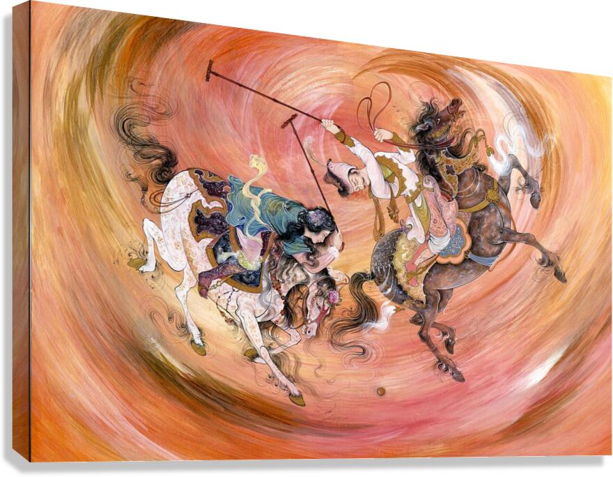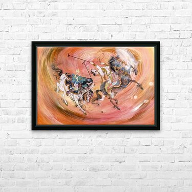 In Polo, Alijanpour revives the spirit of ancient Persian artistry through a breathtaking fusion of motion, elegance, and color. Two riders charge across a swirling vortex of energy — a visual symphony that blurs the line between sport and dance, competition and grace. Rendered in rich tones of amber, gold, and rose, the composition captures both the intensity of the moment and the timeless beauty of human and horse in perfect harmony. This piece is not just about the game of polo — it’s a tribute to rhythm, courage, and the eternal pursuit of mastery.